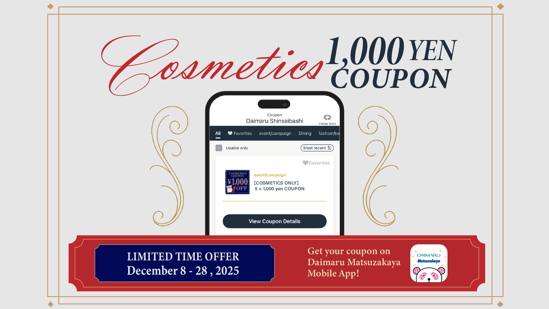 다이마루·마쓰자카야 앱에서 화장품 매장에서 사용할 수 있는 1,000엔 쿠폰 5장을 받아보세요!